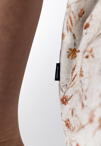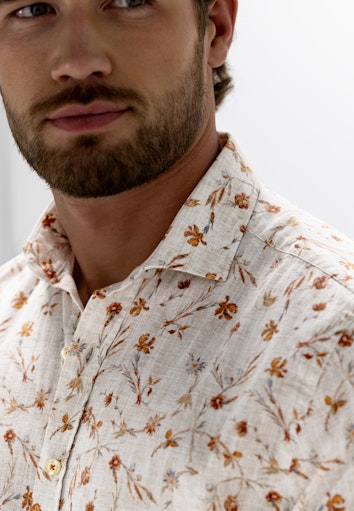 Overhemd met korte mouwen in een regular fit, zonder button-downkraag of borstzak voor een minimalistische uitstraling. De verfijnde botanische print toont een speels patroon van blad en bloemen in natuurlijke tinten, terwijl het subtiele structuurpatroon in de stof extra diepte en een licht gemêleerd effect geeft. Gemaakt van een mix van katoen, biologisch katoen en elastaan en voorzien van het OCS Blended-keurmerk.